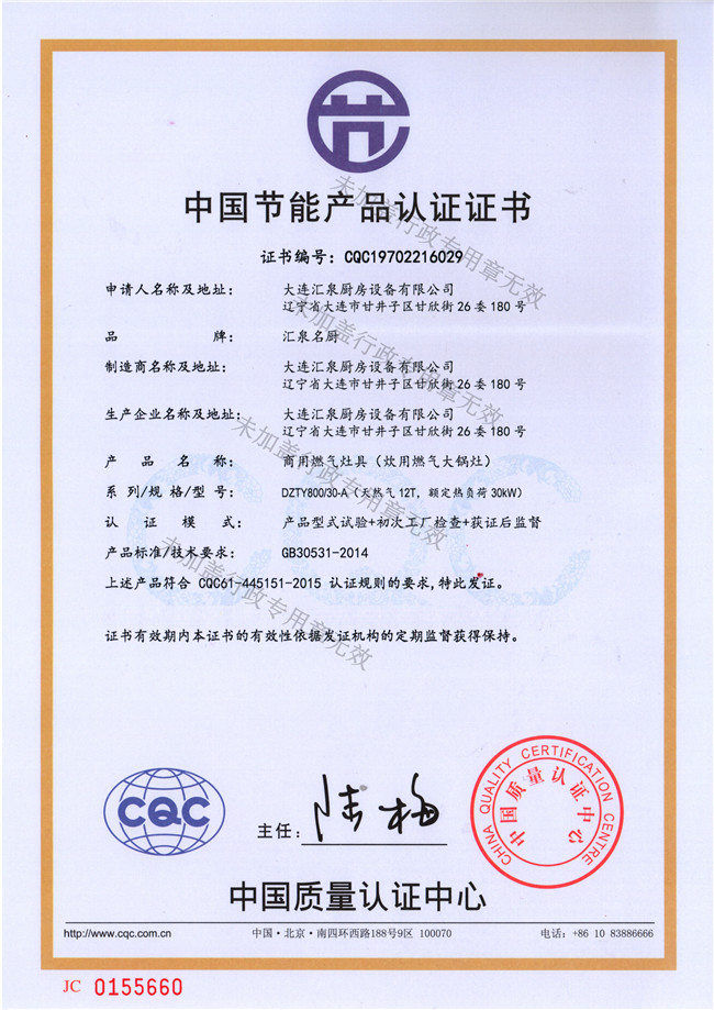 燃氣大鍋灶節能認證證書